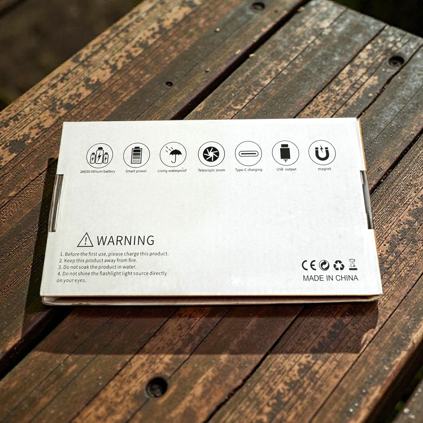 - Package includes flashlight, battery, USB charging cable, and retail box